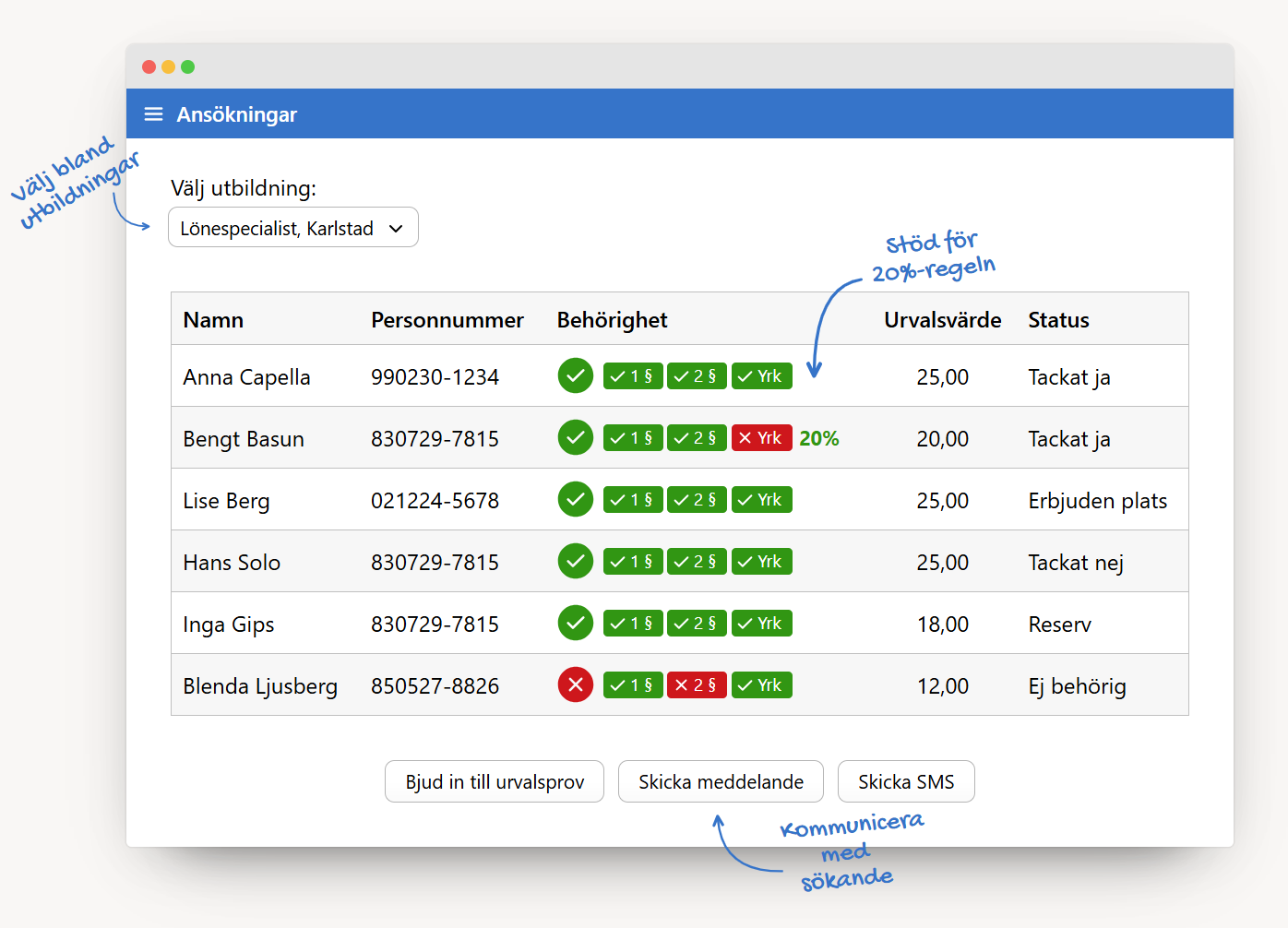 Inbyggd funktion för att skicka kallelser till särskilda prov eller intervjuer. De sökande får kallelse och kan anmäla sig direkt i YH-antagning.